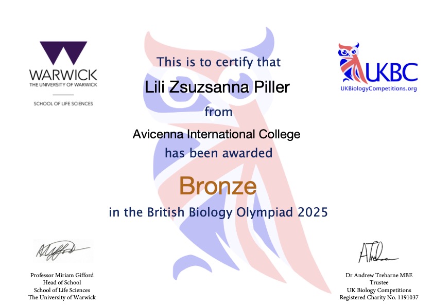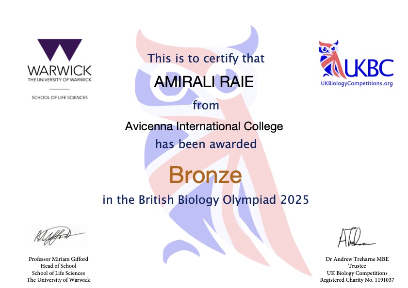 “ Students from G11, G12 and ADPS programs sat for the UKBC British Biology Olympiad 2025 organized at Avicenna International College on February 11, 2025. This competition was participated by 18,533 students from 1053 schools from around the world. Out of the 12 participants in AIC, 1 student could get a Silver, 2 students got Bronze and another 2 achieved Highly Commended Certificates.”