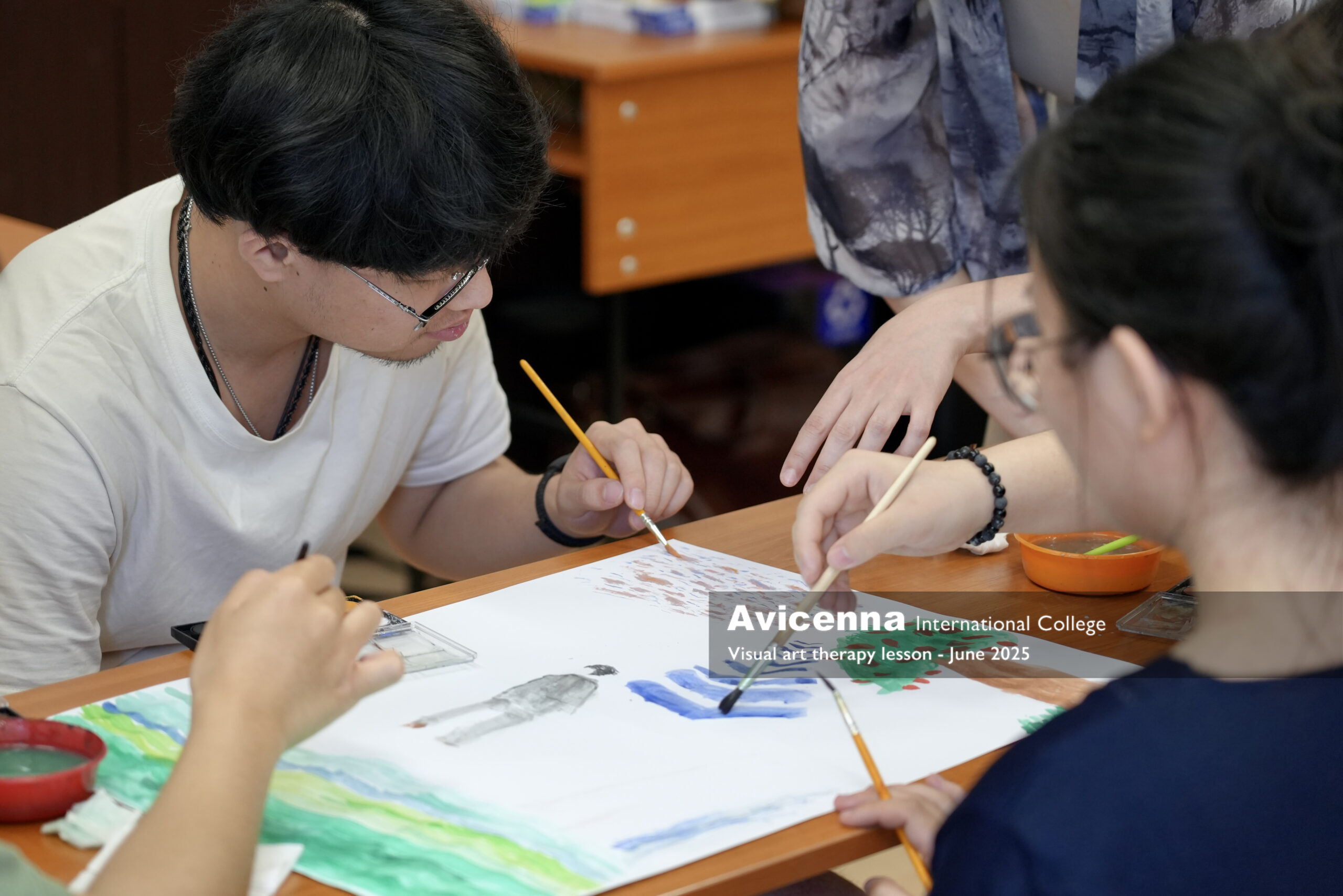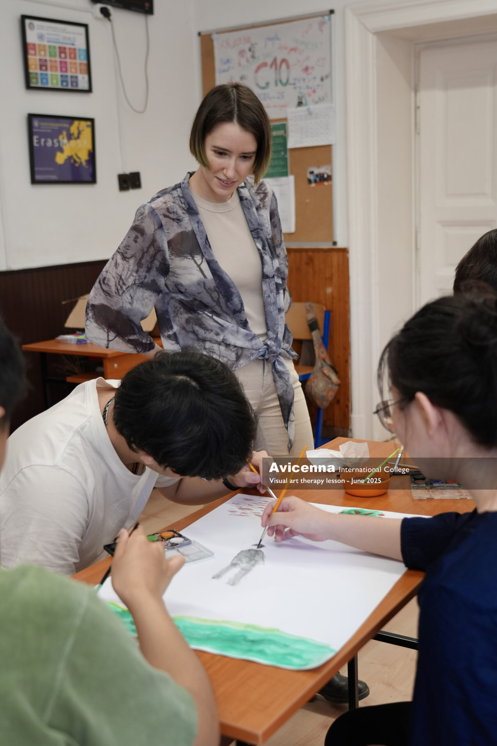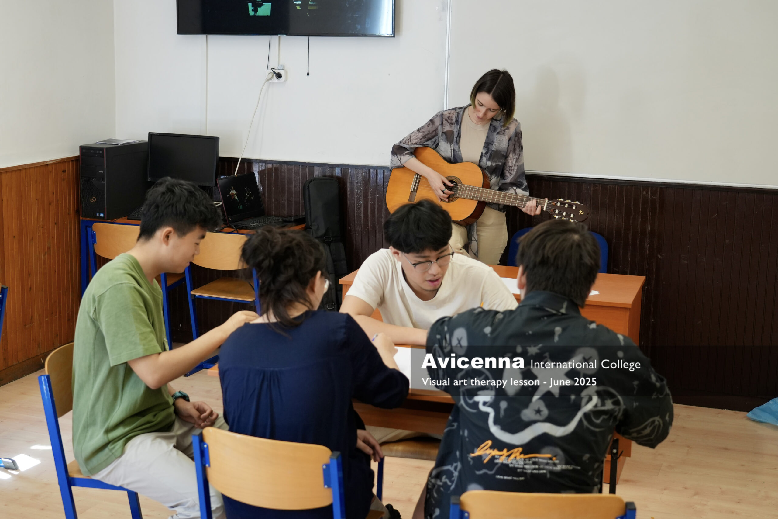 Other students were tasked with expressing the poetry through movement or dance, through music by singing melodies or tapping rhythms to match the mood, or through abstract brushstrokes and lines on a large piece of paper placed in the middle of the room. This was done in groups of three or four. I tried to encourage the more nervous students who volunteered to read, and I demonstrated different types of movement to help them convey emotions. I also played chords on the guitar for those who wanted to accompany the poetry with song. The art teacher provided supplies and offered support and guidance to students working with drawing materials. It was a difficult exercise for many of the students, and I had to gently push several of them just to complete the minimum. However, I was proud of those who still made the effort to participate, and for some, even trying was a meaningful step forward.