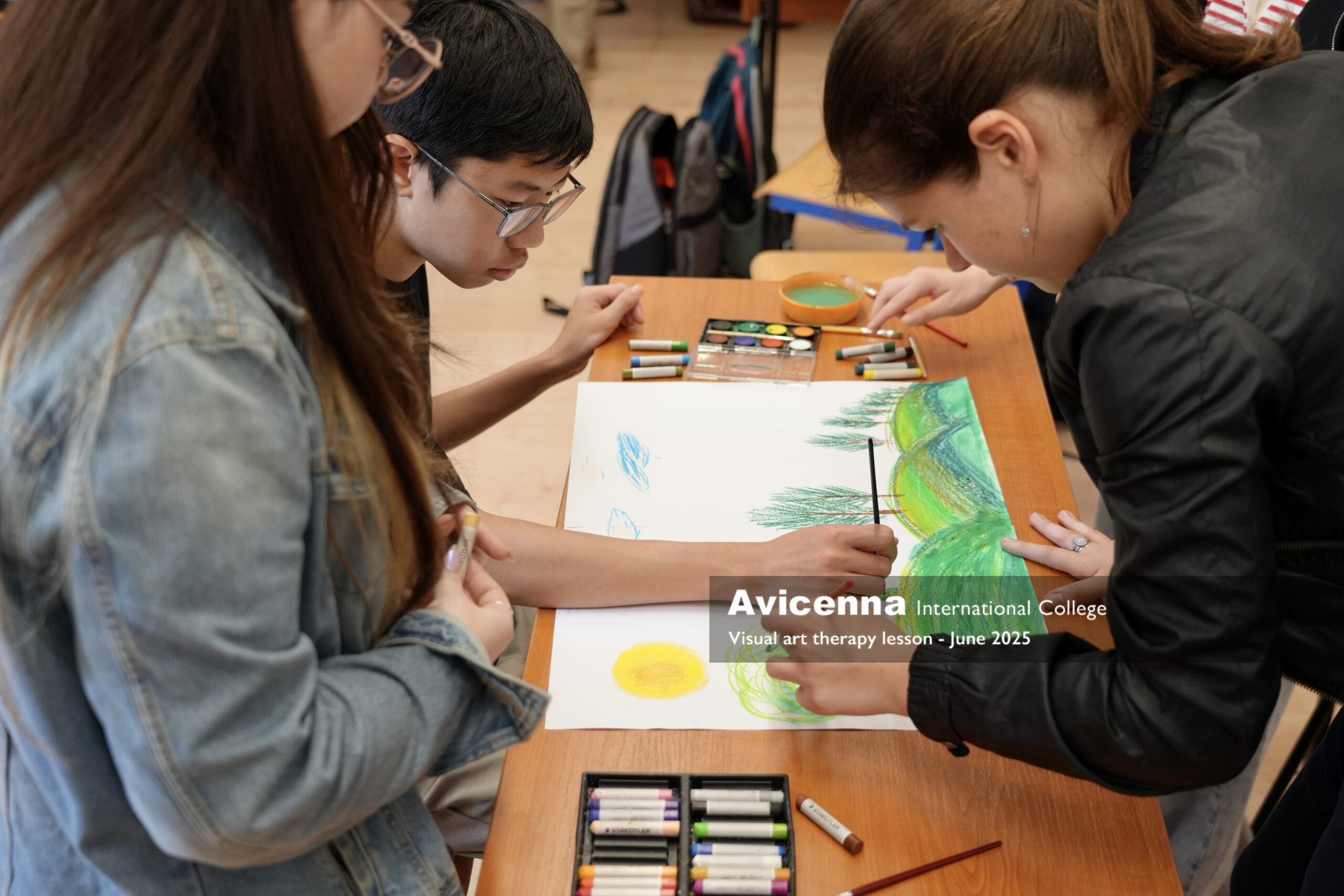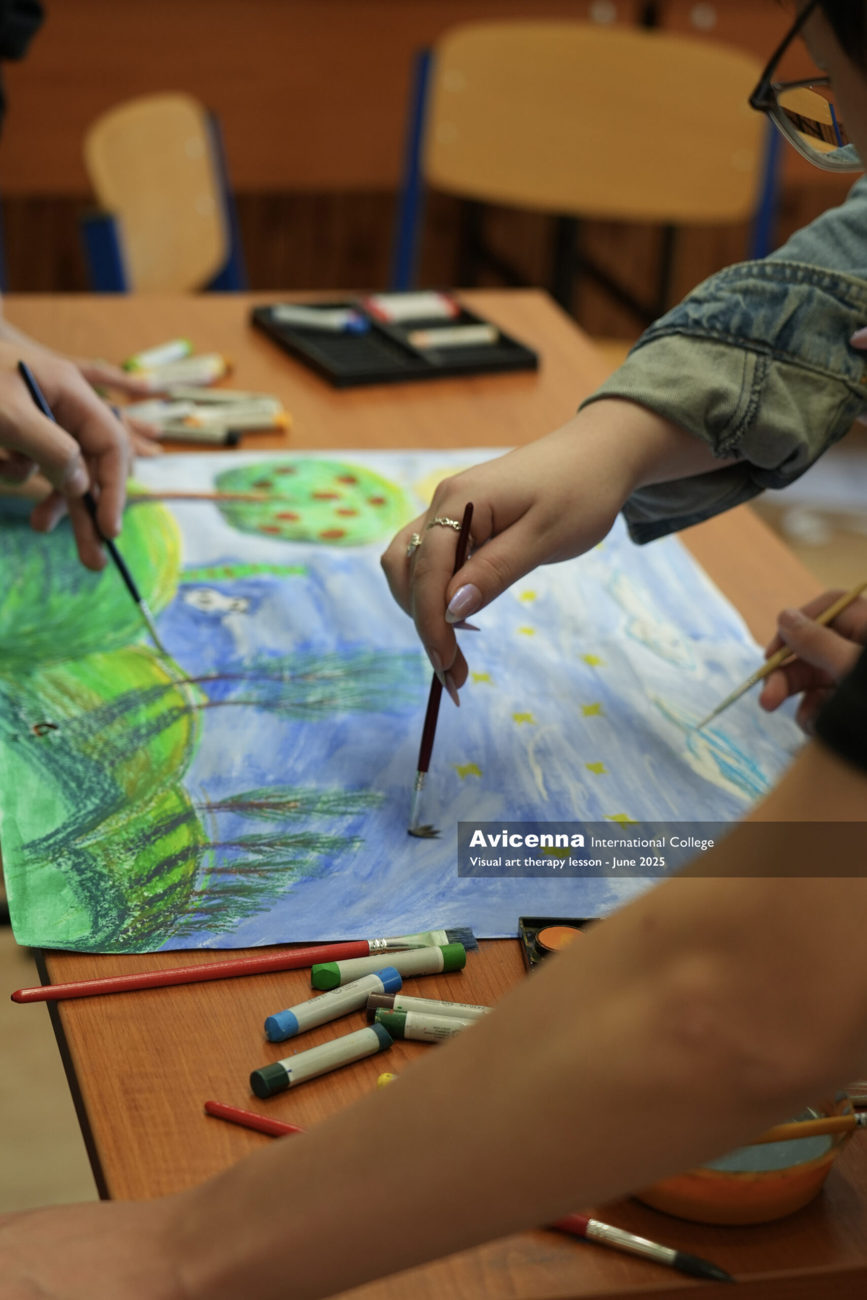 The students were divided into three groups and sat around three tables, each with watercolors, grease paint, and a large sheet of paper. Their task was to paint a story or express raw emotions that came to mind while listening to music.
